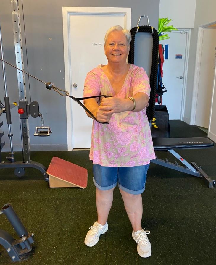 Today she worked through lunges, standing rows, lat pull-downs and squats in the pool, with the water providing support while Gina guided the session throughout.